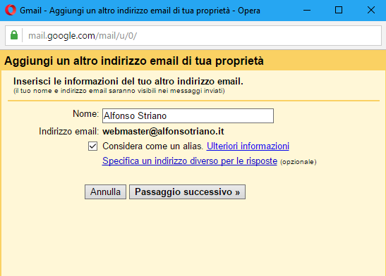 Ora inserisci il tuo nome e lascia la spunta su “Considera come un alias”, infine clicca su “Passaggio successivo”.