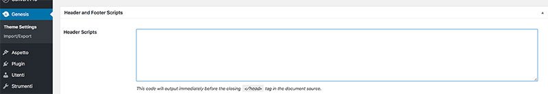 Se invece preferisci inserire i Google Fonts senza plugin devi verificare se il tuo tema consente l’aggiunta di script JS. Alcuni temi hanno questa funzione già incorporata. Ad esempio, con i temi Genesis by Studiopress puoi inserire gli script nell’apposito box dedicato.