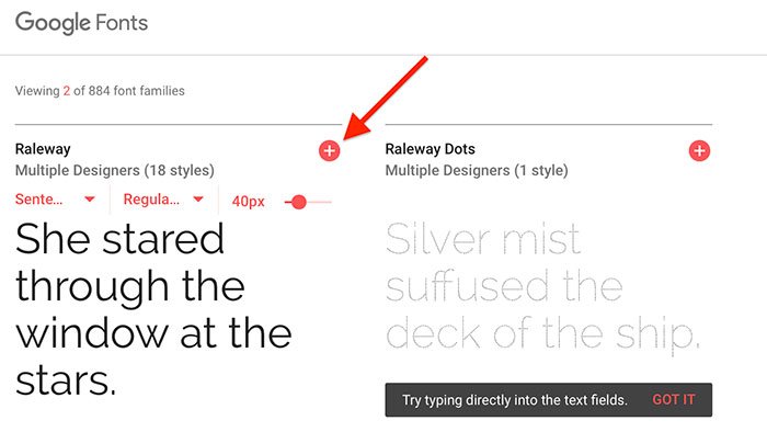 Clicca su “+” per aggiungere il Google Fonts alle tua collezione di Font Google.