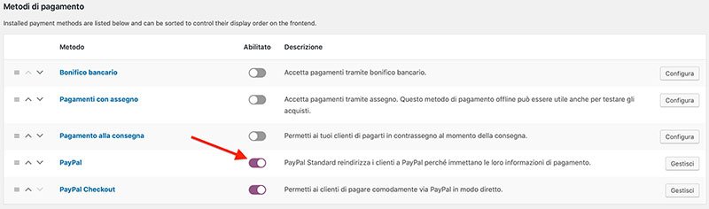 Fortunatamente, il plugin WooCommerce, tra i vari metodi di pagamento proposti, è già perfettamente integrato con PayPal.
