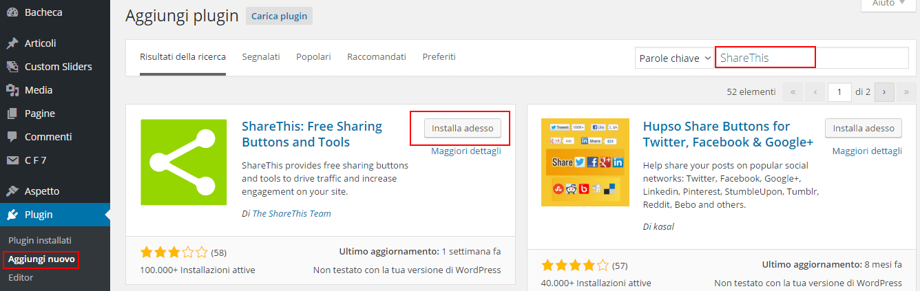 Dalla bacheca di Wp seleziona nella colonna di sinistra la voce Plugin/Aggiungi nuovo e quindi inserisci nella casella di ricerca in lato a sinistra la parola chiave ShareThis.